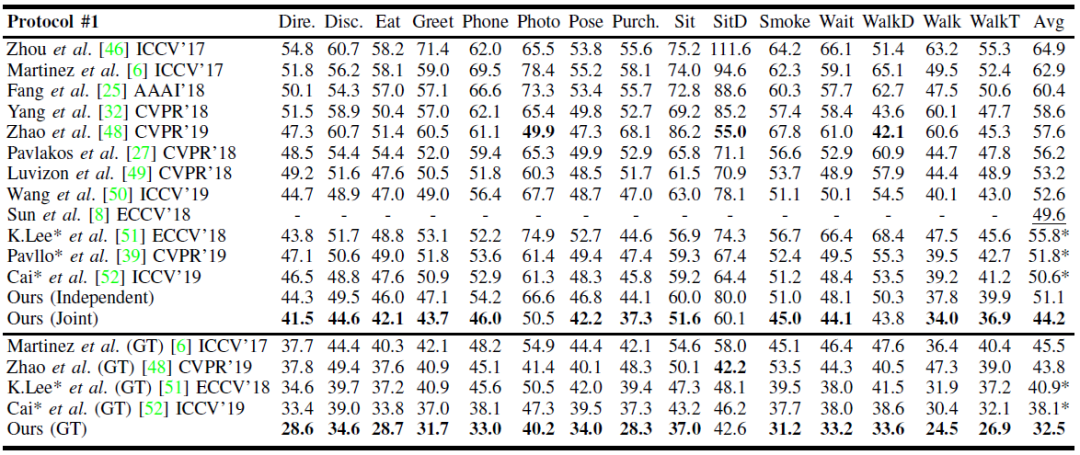 我们在两个基准数据集上评估了我们的方法,观察到 LCN 已达到最好水平并且具有强大的跨数据集泛化能力。表1为在 H36M,即目前最大的三维人体姿态估计基准数据集之一上的表现,其中 Ours(Joint)为我们端到端训练模型的结果,评价指标是预测姿态与真实姿态的平均关节误差值,单位毫米。