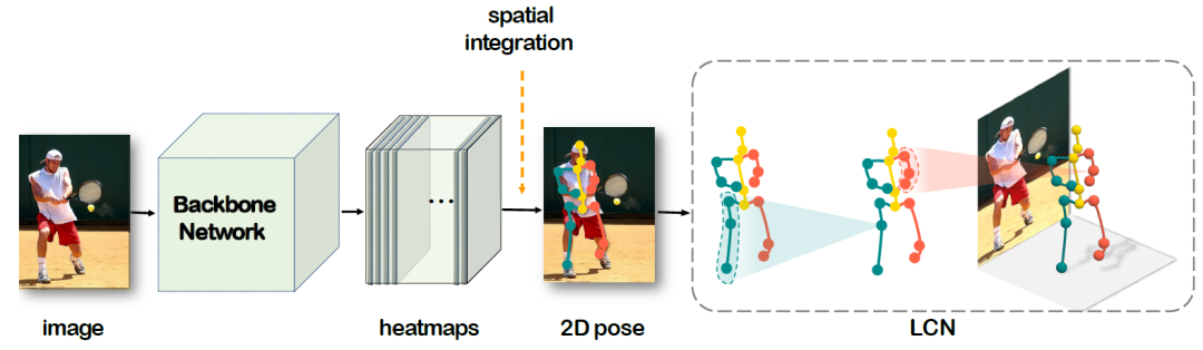 本文中我们提出了一种从单张图像中进行 3D 人体姿态估计的方法(图2)。该方法包括两个步骤:首先从图像中估计 2D 姿态,然后估计相应的 3D 姿态。现有的 2D 姿态估计器已较成熟,我们的改进着重于第二步。考虑到人体关节连接可以自然地用图来表示,我们从图卷积网络(GCN)出发,基于上述广义公式,将 GCN 在用于 3D 姿势估计时为不同关节分配共享过滤器的缺点克服,提出局部连接网络(Local Connected Network,LCN),以为不同的关节分配专用而非共享的过滤器。利用空间积分的常用可微手段(spatial integral)(参考文献3),我们联合已有的 2D 姿态估计器和 LCN 网络进行端到端训练,使其可以处理不断迭代变化的 2D 姿态。