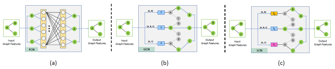图1. FCN,GCN 与本文所提出的 LCN 模型中某一层网络的概念性差异示意图