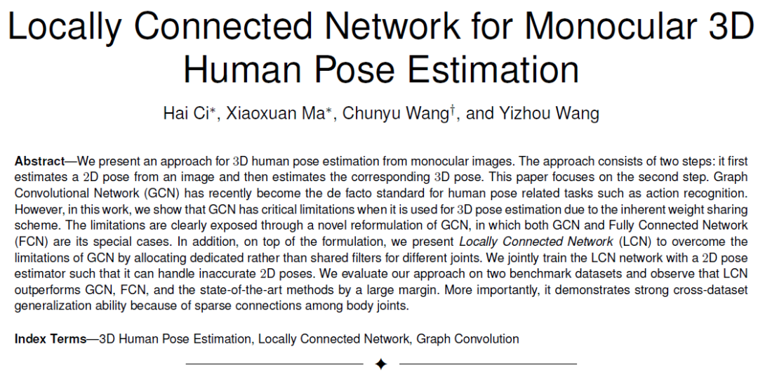 本文是被人工智能领域的顶级期刊 IEEE Transactions on Pattern Analysis and Machine Intelligence(TPAMI)于2020年8月接收的论文《用于单目3D人体姿态估计的局部连接网络(Locally Connected Network for Monocular 3D Human Pose Estimation)》的解读。
