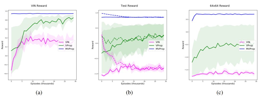 图 2:在我们的课程中所训练的所有模型的平均、最小和最大奖励。请再次注意,在前两张图中,地图大小为 32×32。a 和 c 分别展示了 VIN 数据集和我们生成的 64×64 图的性能。b 显示受课程设置所限(虚线)和未受限(实线)时在评估图上的表现情况。