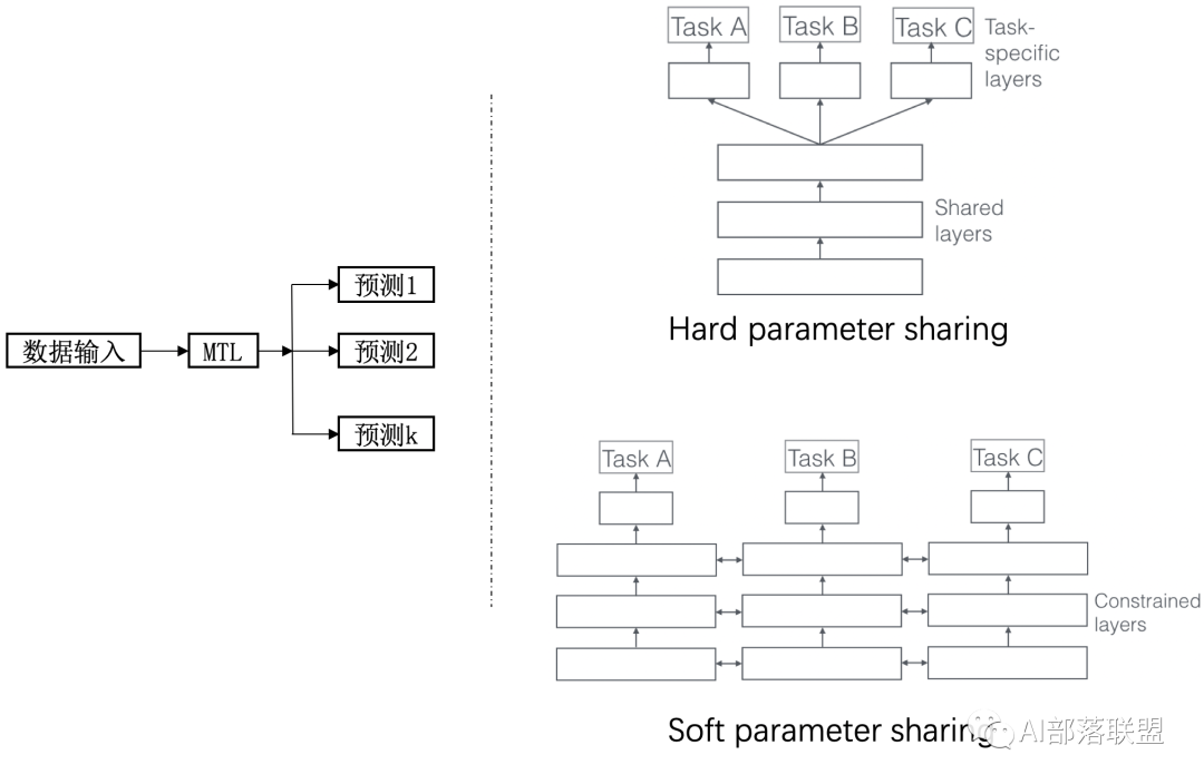 通常将多任务学习方法分为:hard parameter sharing和soft parameter sharing。区别在于对图1右边MTL那一个方块。