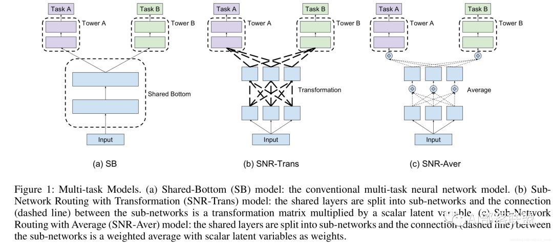 A . 竖着切了吃:对共享层进行区分,也就是想办法给每个任务一个独特的共享层融合方式。图3的MOE和MMOE模型就是竖着切了吃的例子。另外MMOE在MOE的基础上,多了一个GATE,意味着:多个任务既有共性(关联),也必须有自己的独特性(Task specific)。共性和独特性如何权衡:每个任务搞一个专门的权重学习网络(GATE),让模型自己去学,学好了之后对expert进行融合送给各自任务的tower,最后给到输出,2019年的SNR模型依旧是竖着切开了吃,只不过竖着切开了之后还是要每一小块都分一点放一起送给不同的流口水的人。(可能某块里面榴莲更多?)