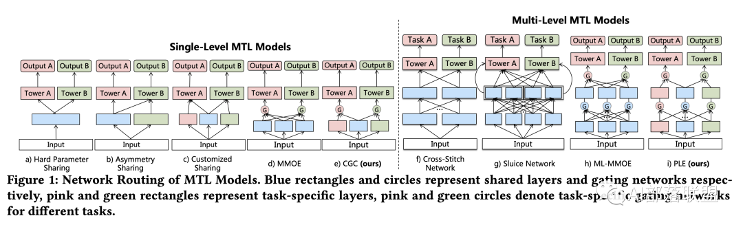 B:一层层拿来吃:对不同任务,不同共享层级的融合方式进行设计。如果共享网络有多层,那么通常我们说的高层神经网络更具备语义信息,那我们是一开始就把所有共享网络考虑进来,还是从更高层再开始融合呢?如图6最右边的PLE所示,Input上的第1层左边2个给了粉色G,右边2个给了绿色G,3个都给了蓝色G,然后第2层左边2块给左边的粉色G和Tower,右边两块输出到绿色G和Tower。