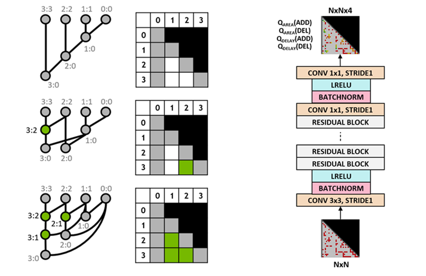 研究者采用Q学习(Q-learning)算法来训练智能体电路设计。如下图3所示,他们将前缀图分解成网格表示,其中网格中的每个元素唯一地映射到前缀节点。这种网格表示用于 Q 网络的输入和输出。输入网格中的每个元素表示节点是否存在。输出网格中的每个元素代表添加或删除节点的 Q 值。