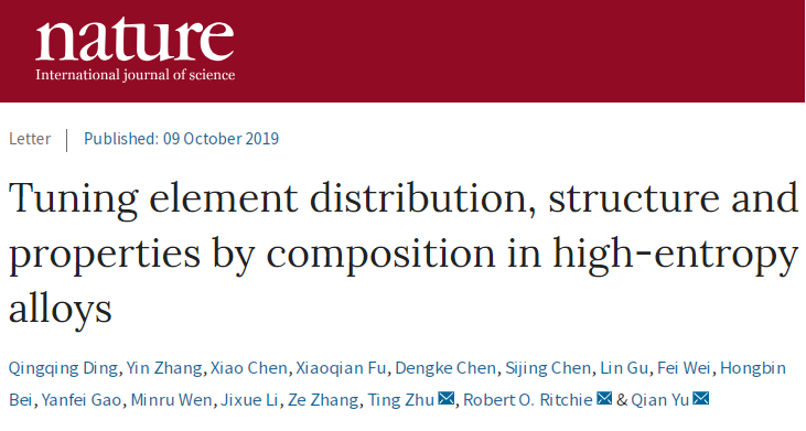 相关论文Tuning element distribution, structure and properties by composition in high-entropy alloys (《高熵合金成分调控下的元素分布、微结构和性能》)2019年10月10日在Nature杂志发表。这是科学界首次在实验上解析高熵合金中的元素分布规律。学界认为,调控浓度波将成为一种普适性的方法,帮助人们高效地寻找到更优秀的合金材料。