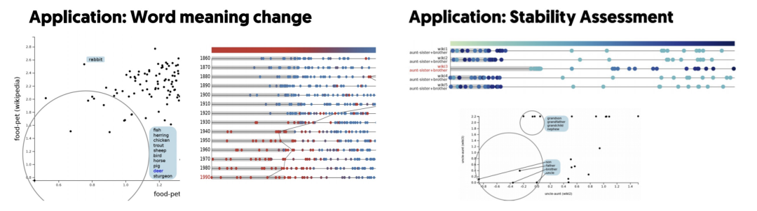图 3 可视化设计用于理解语义变化(左)以及评估词嵌入模型的稳定性(右)