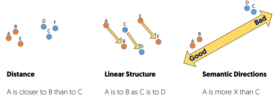 图 1 嵌入处理可有效表达高维数据对象之间的关系,包括距离、线性结构和语义方向。