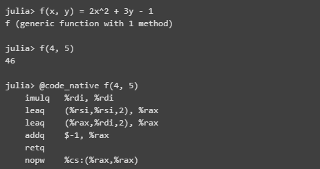 可以看到,Julia 的这种容易程度完全不同 —— 我从来都不想费心去看C中的汇编代码,因为这样做很痛苦,但我一直在看 Julia 汇编代码,因为它的可读性很好,而且我知道很多其他代码也是如此。这既是一种学习工具,也是指导整个生态系统实现卓越性能的一种方式。