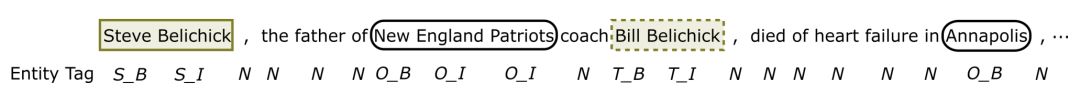 Action:action 会给当期的词分配一个 tag,tag 包括 A=({S,T,O}×{B,I})∪{N}。其中,S 是参与的源实体,T 是目标实体,O 是和关系无关的实体,N 是非实体单词,B 和 I 表示一个实体的开始和结束。可参看下图: