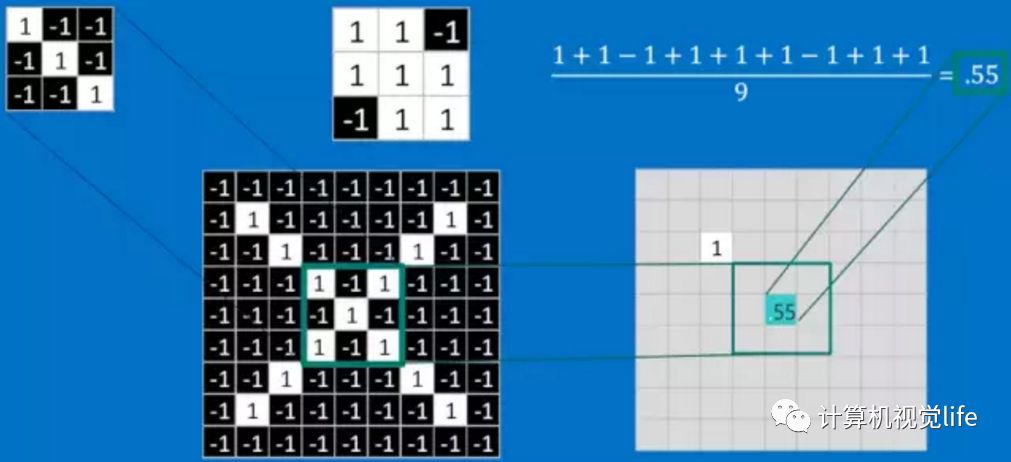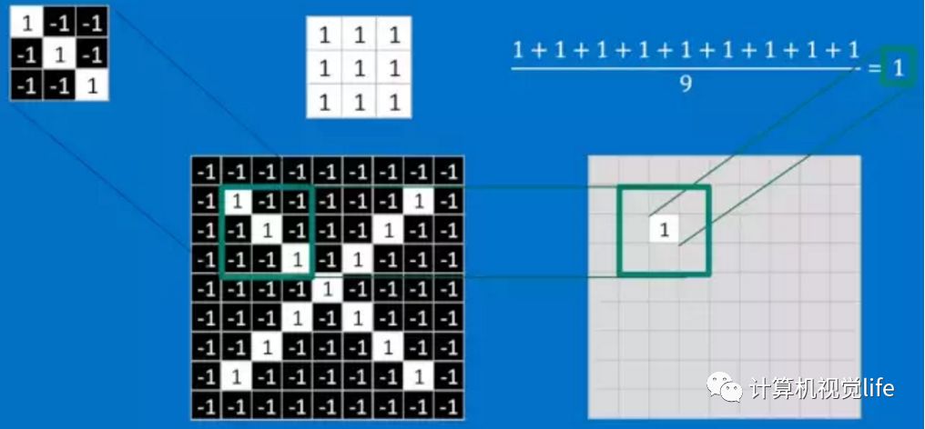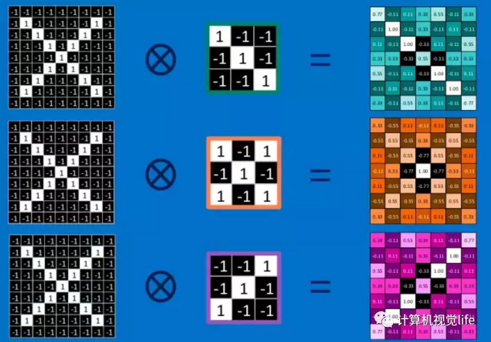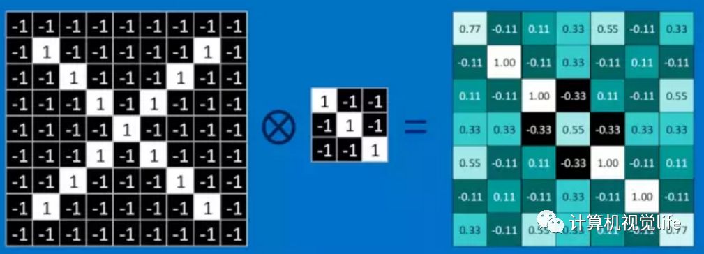 仔细观察,可以发现,其中的值,越接近为1表示对应位置和卷积核代表的特征越接近,越是接近-1,表示对应位置和卷积核代表的反向特征越匹配,而值接近0的表示对应位置没有任何匹配或者说没有什么关联。