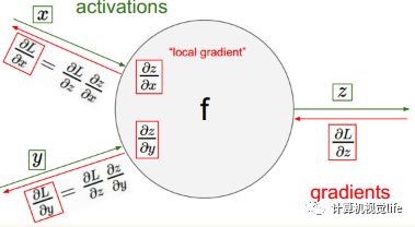 举一个简单例子。绿色箭头代表前向传播,红色代表为反向传播过程,x、y是权重参数,L为误差,L对x、y的导数表示误差L的变化对x、y的影响程度,得到偏导数delta(x)后,x* = x-η*delta(x),其中η为学习率,从而实现权重的更新。
