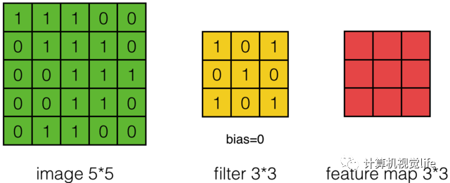 假设有一个5*5的图像,使用一个3*3的卷积核(filter)进行卷积,得到一个3*3的矩阵(其实是Feature Map,后面会讲),如下所示: