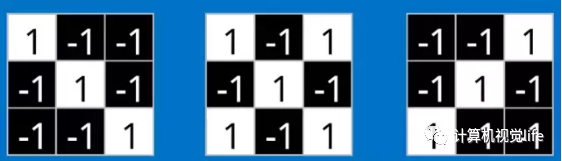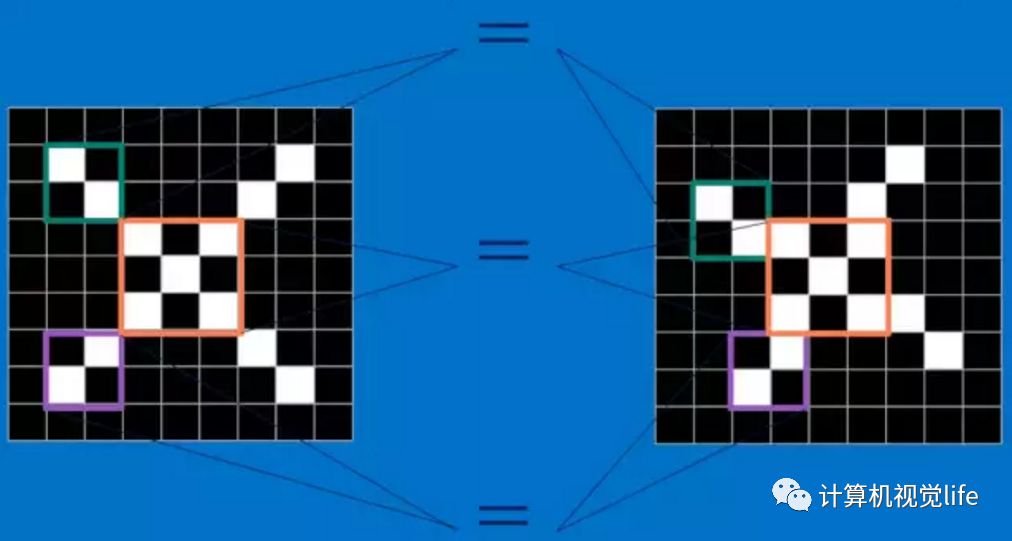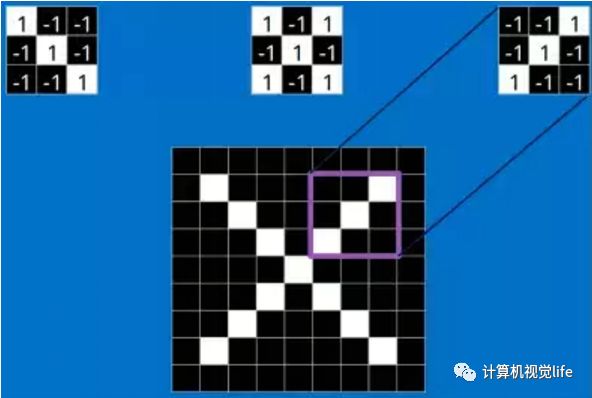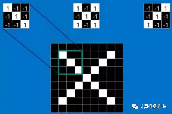 如下图所示,像素值"1"代表白色,像素值"-1"代表黑色。对于CNN来说,它是一块一块地来进行比对。它拿来比对的这个“小块”我们称之为Features(特征)。在两幅图中大致相同的位置找到一些粗糙的特征进行匹配,CNN能够更好的看到两幅图的相似性。