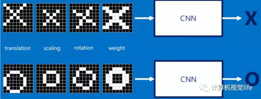 在CNN中有这样一个问题,就是每次给你一张图,你需要判断它是否含有"X"或者"O"。并且假设必须两者选其一,不是"X"就是"O"。理想的情况就像下面这个样子:
