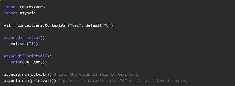 下面是一个如何在Python 3.7中设置和使用上下文变量的快速示例。请注意,当你运行这个例子时,第二个async调用将生成一个默认值,因为它在不同的上下文中进行了计算。