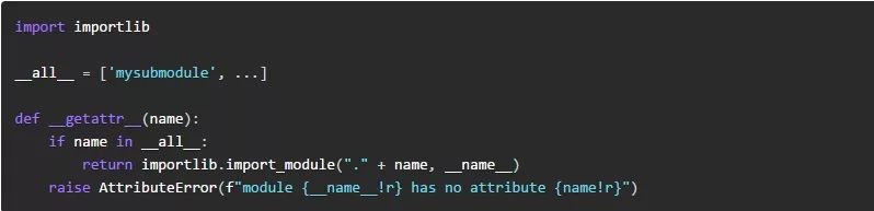 在不深入探讨这种方法所暴露的技术可能性的情况下,它最清晰和最明显的用例之一是,它现在允许模块延迟加载。请思考下面的例子(从PEP-562修改而来)以及它的用法。