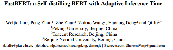 本文介绍的是 ACL 2020 论文《FastBERT: a Self-distilling BERT with Adaptive Inference Time》,论文作者来自北大、腾讯以及北师大。