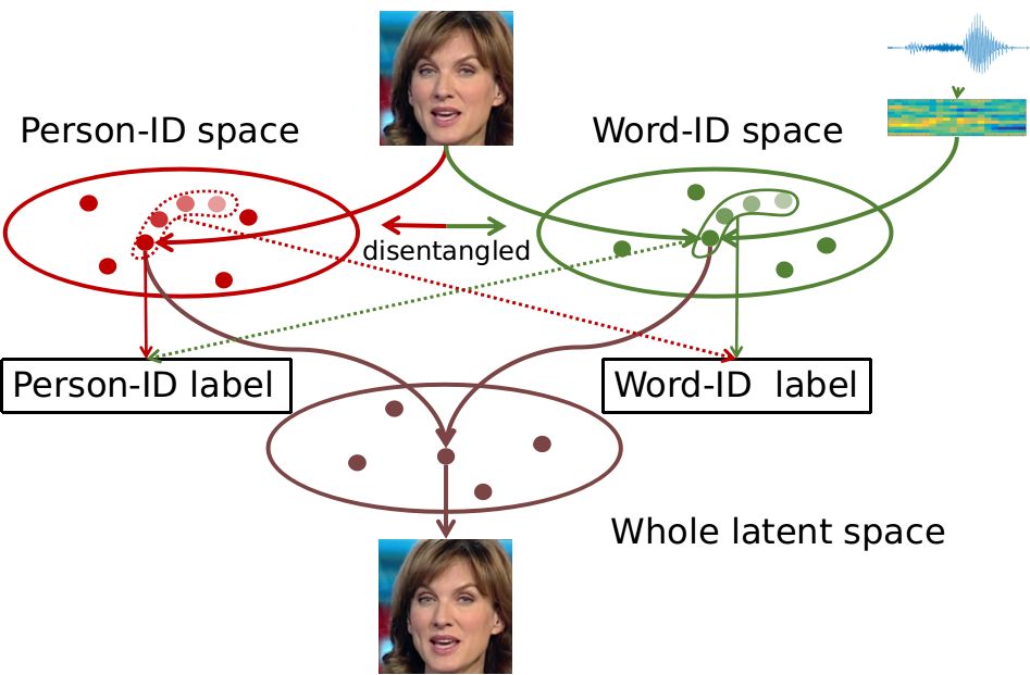 如果能有方法将这两种表示所在的空间的信息解离开,则保持身份特征信息不变,使说话内容空间的信息根据音频流动,再将两个空间的信息组合就可以达到任意 PID 说任意 WID 的目标。大体思路如下图所示: