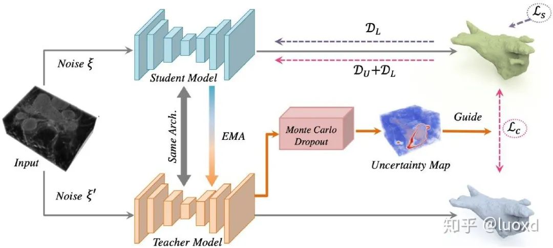 总结:这篇文章整合了Mean Teacher (NIPS2017) 和不确定性估计来进行半监督学习,通过不确定性图来指导(加权)Mean Teacher模型从未标注的数据上逐步学习。不确定性图的计算采用了经典的蒙特卡洛 Dropout多次推理来获得,这样会带来一些额外的计算开销,但带来了性能的提升,可以得到不错的效果,而且现在利用不确定性估计来提高网络性能也是一个热门的研究方向。
