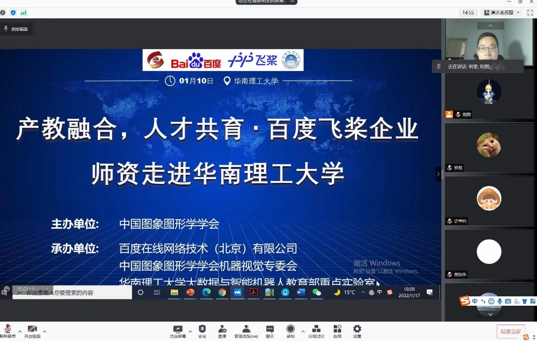 2022年1月10日,CSIG论坛:“百度飞桨企业师资走进华南理工大学”成功在线上举办。本次论坛由中国图象图形学学会(CSIG)主办,百度飞桨、中国图象图形学学会机器视觉专委会和华南理工大学大数据与机器人教育部重点实验室共同承办,旨在推动百度飞桨开源深度学习平台在高校的教学推广,构建高校和企业间的技术交流通道。本次论坛邀请百度飞桨团队成员进行分享,来自华南理工大学的250余名师生在线参与了本次论坛。