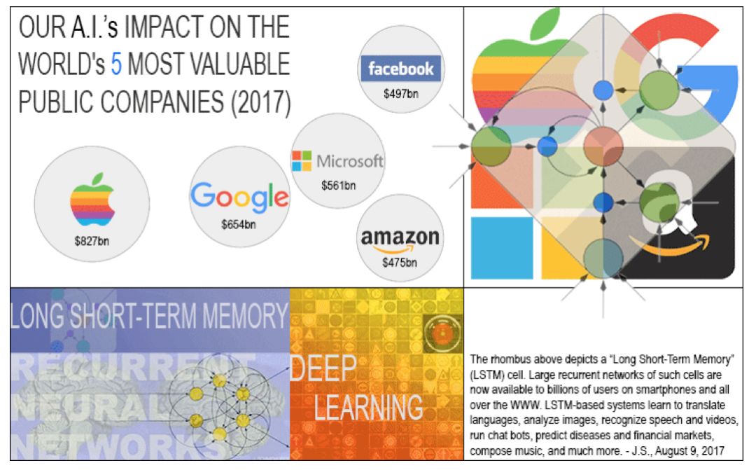 2016年:首个端到端神经机器翻译也是基于LSTM。我的博士生Felix Gers早在2001年就证明LSTM可以学习传统模型(例如HMM)无法学习的语言。也就是说,“亚符号”的神经模型突然擅长学习“符号”任务!这得益于计算硬件的提升,到2016-17年,Google Translate和Facebook Translate都基于两个相连的LSTM,其中一个用于传入文本,一个用于传出翻译的文本。到2017年,基于LSTM,Facebook的用户每周会进行300亿次的翻译。做个对比:最受欢迎的youtube视频(歌曲“ Despacito”)在两年内仅获得了60亿次点击。