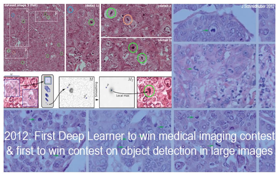 在2011年硅谷的IJCNN上,DanNet是第一个在视觉模式识别竞赛中超过人类水平,甚至《纽约时报》也提到了这一点。它也是第一个获胜的深层CNN:同时赢得了中国手写竞赛(ICDAR 2011)、图像分割竞赛(ISBI,2012年5月)、大型目标检测竞赛(ICPR,2012年9月10日)关于癌症检测的医学影像比赛(这些比赛全部都在ImageNet 2012之前)。我们的CNN图像扫描仪比以前的方法快1000倍,在医疗保健等方面具有极其重要的意义。如今,IBM、西门子、谷歌和许多新兴公司都在跟随这一方法。许多现代计算机视觉的方法就是作者在2011年研究工作的扩展。