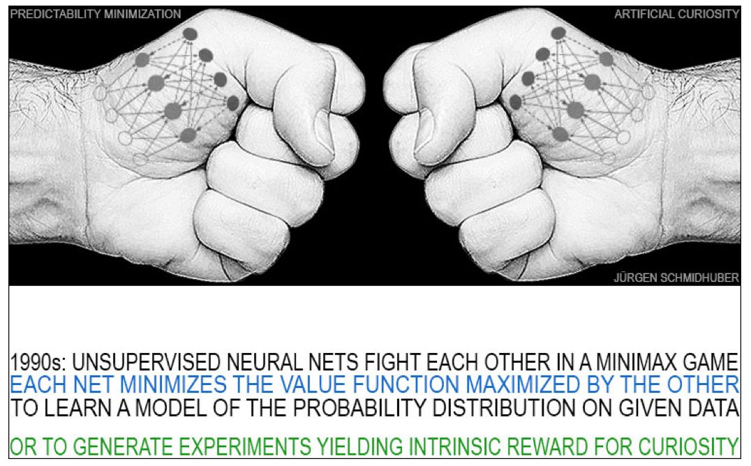 生成对抗网络(GAN)是在2010年代非常流行的另一个概念。GAN是作者在1990年对流行的对抗好奇心原理的一个实例。该原理如下:一个神经网络概率地产生输出,另一个神经网络看到这些输出并预测对其的反应。使用梯度下降方法,将预测器NN的误差最小化,而生成器NN则使其误差最大化。一个网络的损失就是另一网络的收益。GAN是这种情况下的一种特殊情况。