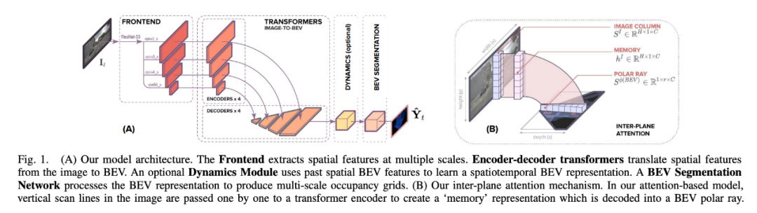 ,其目标是学习图像中的垂直扫描线(vertical scan lines)和 BEV 中的极射线(polar ray)之间的对齐。因此,这种射影几何对网络来说是隐式的。