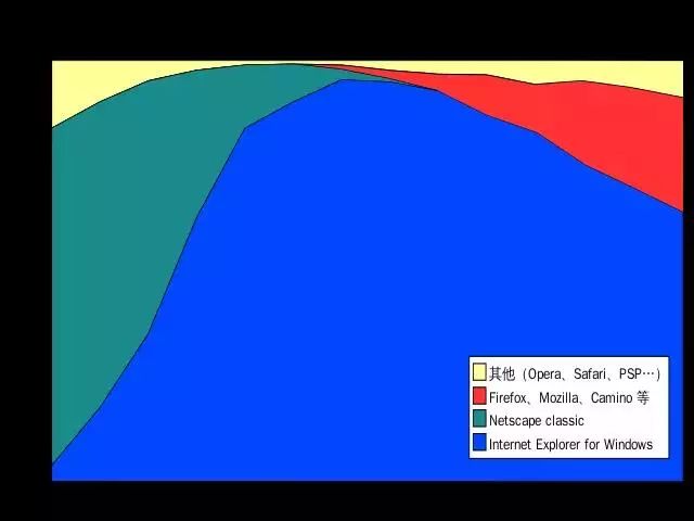 第一阶段是两巨头相争,微软的 IE 浏览器逐步取代网景的 Netscape,成为市占率第一的浏览器。