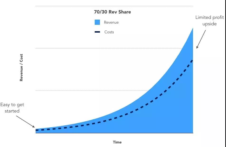 收入分成使得进入市场更容易,但平台方难以利用规模效应,收入增长被成本增长拖了后腿