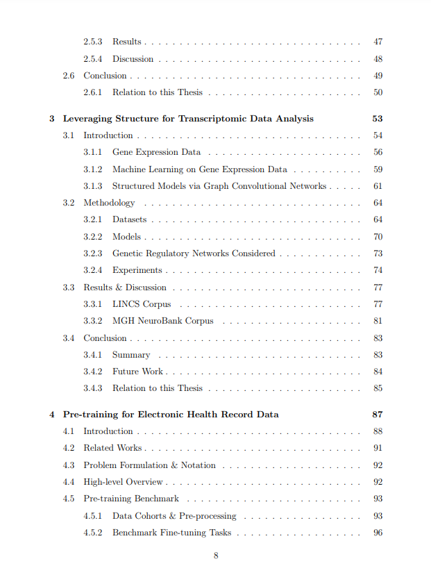 总的来说,在这篇论文中,我们将证明整合结构,无论是直接从数据中学习还是通过外部知识,都可以显著提高临床和生物医学机器学习的性能。