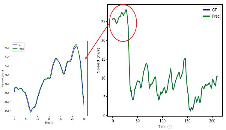 图 7 多模态多任务网络在Udacity数据集上的速度预测结果