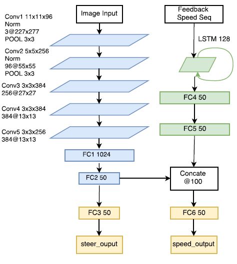 卷积层具有与基础转向模型中结构相同,被编码的视觉特征被馈送到LSTM层用于时间维度上的分析,进而输出图像序列特征用于转向角回归和速度指令分类。作为第一步,速度指令包含三个类:“加速”,“减速”和“保持速度”。其中,作者使用交叉熵进行速度指令的分类。