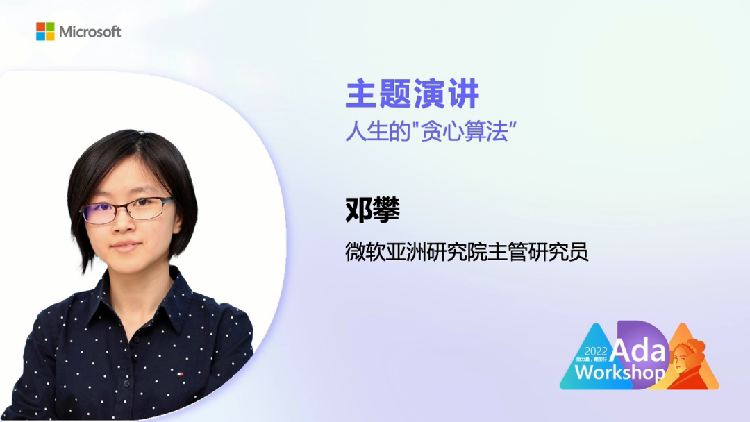 科研之路并非繁花似锦,很多时候是在一条没有脚印的道路上探索未知。科研之路应该怎么走?如何抓住机遇实现转弯?微软亚洲研究院主管研究员邓攀在以《人生的“贪心”算法》为题的演讲中,分享了自己从本科毕业到现在一路走来的经历与收获。从生物跨界到计算机,邓攀是如何做到“内心有谱,丝毫不慌”的?遇到机会,她又是如何竭尽全力把握住每一个可能的?一起来看邓攀怎样编写了自己人生的“贪心”算法吧!