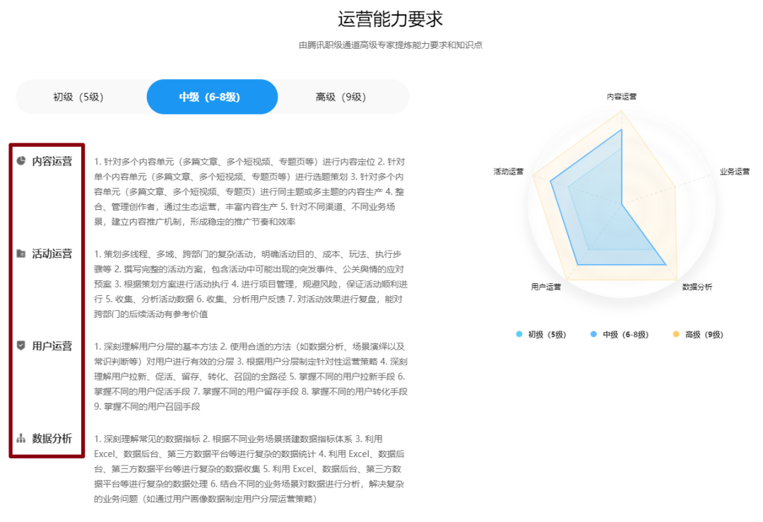 翻看腾讯运营人能力标准模型,得出初、中、高每个级别需要掌握的能力要求,给大家参考。