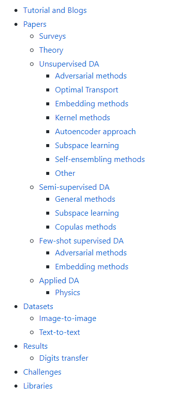 本库收集了大量的迁移学习以及领域自适应的论文和项目资源,虽然该库的资源主要针对领域自适应技术,但是也有些迁移学习其他子领域的资源供各位开发者参考学习。