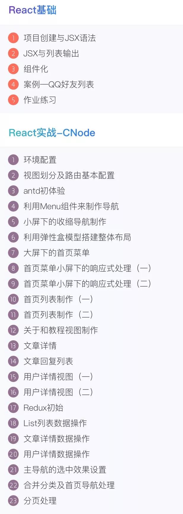 别着急,今天整理了一套《React 基础+实战CNode》系统视频,带着大家快速了解 React 的基本逻辑和语法,其中综合实战项目包含了React 全家桶相关技术点的使用,以及搭建一个 React 项目的思考,特别适合大家入手。