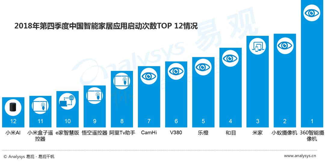 摄像头进行监控,手机控制智能家居和智能音箱播放是用户启动最多的3大主流硬件。