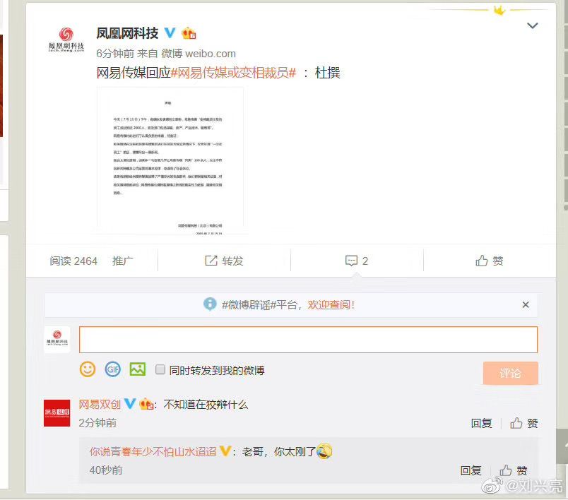 针对此消息,网易新闻客户端官方微博随后发声明称有媒体报道的“网易传媒变相裁员,涉及员工或达到近2000人”相关新闻系假消息,并不属实。