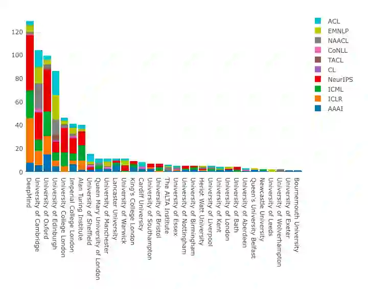 在英国, 谷歌麾下的DeepMind 遥遥领先,其后是剑桥大学、牛津大学、爱丁堡大学、伦敦大学学院、帝国理工大学和阿兰图灵机构。值得注意的是,阿兰图灵机构由剑桥、牛津、爱丁堡、华威和伦敦大学学院五所大学领导,所有该机构的论文发表数据与其他几所大学有一定交叉,因此具体数据比较模糊。论文发表数量排在前七的机构中,剑桥大学和爱丁堡大学主要聚焦于 NLP 领域,而其他机构则主要专注于 ML 领域。