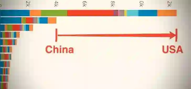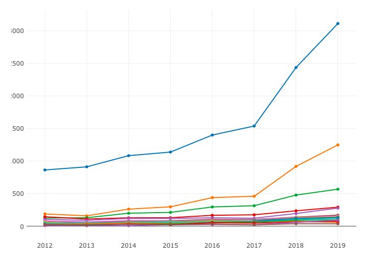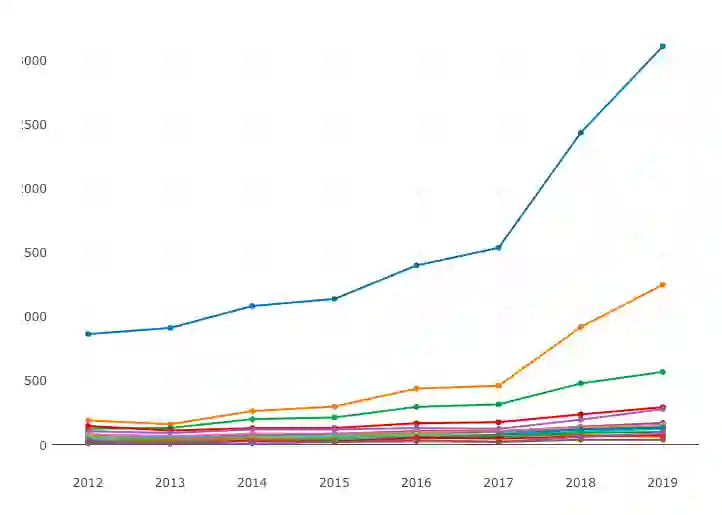 分析2019年各国家和地区的论文发表数量,这还是首次。不可否认地,下面这张统计图展示了美国在 AI 领域“力压群山”的主导地位,不过中国、英国、德国和加拿大在该领域所发挥的影响力也不容小觑。单独从各大会议会议上来看,中国在 AAAI 上的论文发表数量甚至与美国持平,可见中国研究者在 AAAI 上扮演着举足轻重的角色。另外中国在NeurIPS、EMNLP、ACL 等会议上的表现也非常出色,虽然可能不及在 AI 领域本就拥有先天优势的美国,但是遥遥领先于其他国家和地区。下图展示了2012年至2019年各国家和地区的论文发表总数,整体排名和差距情况与2019年各国家和地区的发表论文数量差不多。这些年来,美国的论文发表数量都一直远超其他国家和地区,并且现在还在加速拉大这一差距。而中国则在拼尽全力与美国匹敌,如今也以不断增大的幅度领先于美国以外的其他国家和地区。而英国虽然在论文发表数量以及增长幅度上不及美国和中国,也还是牢牢锁住了第三的位置。