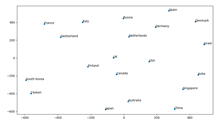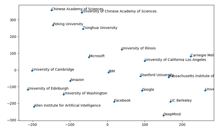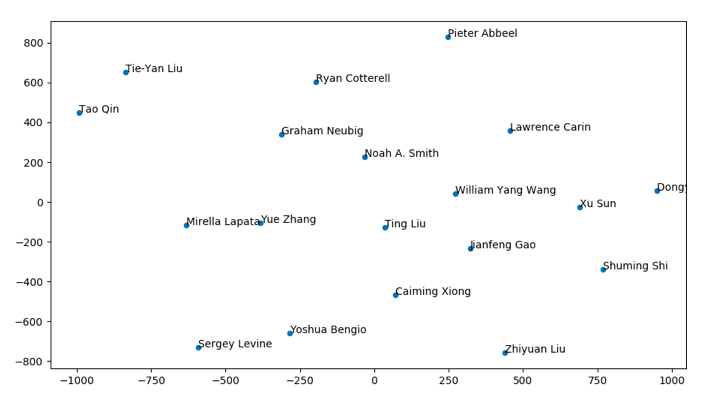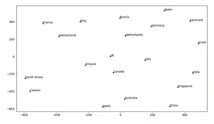 Marek 也做了另外一项分析,即根据论文研究课题进行相似性分析,得出一些有意思的结论:首先是组织之间的相似性,从下图可以看出,来自中国的大学主要集中在图的上部分,美国大学主要在图的右侧,欧洲则在左侧,企业在中间。因此可以看出研究课题即是非常具有区域性的,高校之间的相互合作受地域影响很大,而企业则相对就比较灵活。相似性也可以应用到作者的分析上,下图的紧密度反映了研究者之间研究课题的相似性和合作频率。从图中可以看出秦涛(Tao Qin)和刘铁岩(Tie-Yan Liu)很近,这很容易理解,他们都在微软亚洲研究院工作。也可以将相似性分析应用到国家和地区。不过鉴于每个国家都会有许多不同的主题,下面这个图可能更能代表它们的合作频率。中国居于右下角,距离较近的是新加坡、澳大利亚、日本等,但距离其他国家和地区就比较远了,例如与台湾、韩国、法国等的合作就不是很紧密。而美国和英国在国际合作上相对比较多元化。