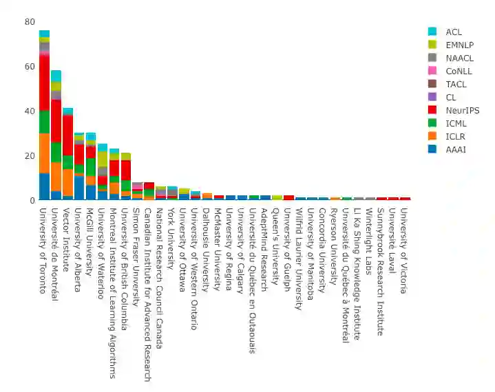 在加拿大,多伦多大学的论文发表数量是各机构中最出类拔萃的,排在第一,随后是蒙特利尔大学、Vector 人工智能研究院,分别排第二、第三。滑铁卢大学是聚焦于 NLP 领域研究的唯一一所机构,而其他机构的论文大多数都发表在 ML 的相关会议上。