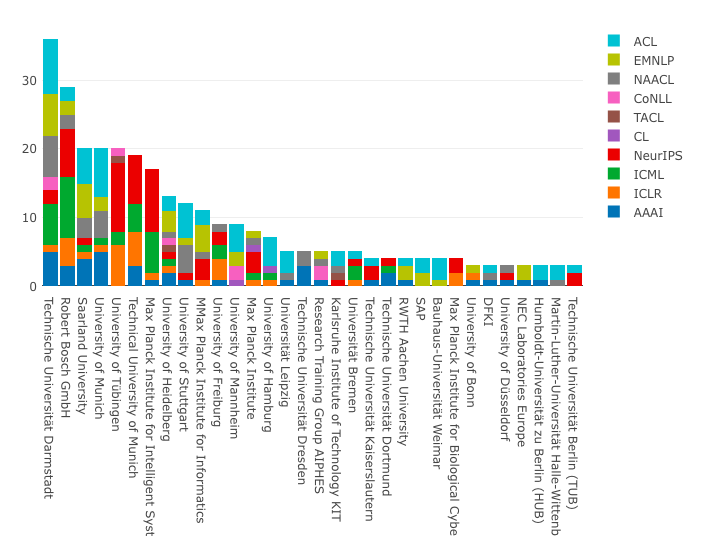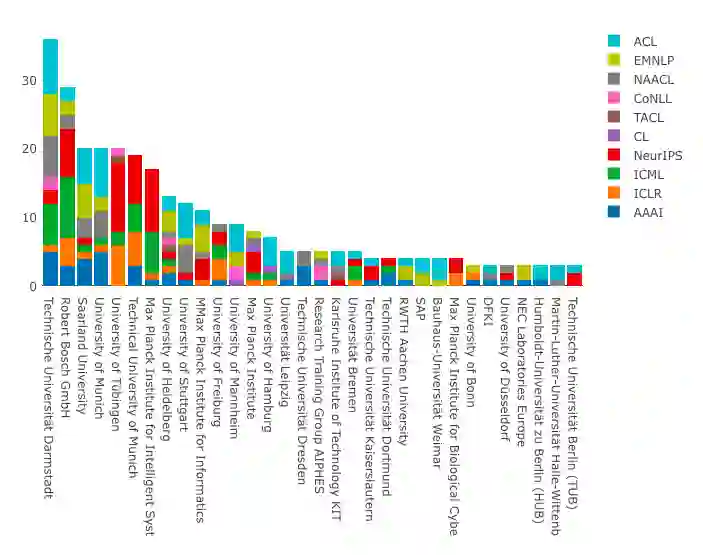 在德国,达姆施塔特工业大学是论文发表数量最多的机构,尤其是在 NLP 领域,论文发表数量占德国论文发表总数的 2/3。罗伯特·博世有限公司总体论文发表数量排在第二,但 ML 领域的论文发表数量却是德国机构中最多的。随后是萨尔大学、慕尼黑大学、图宾根大学、慕尼黑工业大学、马克斯普朗克智能系统研究所,分别排在第三至第第七的位置。