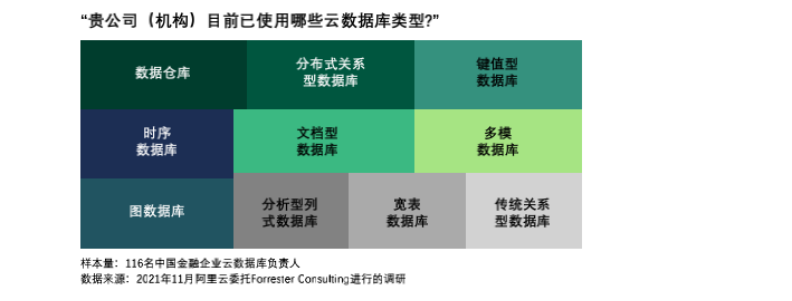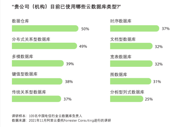 来自 Forrester 的白皮书显示,58% 的受访者表示已经在使用云数据仓库,53% 的受访者已经在使用分布式关系型数据库,而时序数据库、图数据库、多模数据库等 NoSQL 数据库也均获得了超过 30% 的受访者的使用。