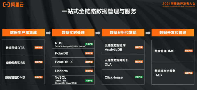 在 2021 年的阿里云开发者大会上,阿里云数据库提出的一站式在线数据管理平台的理念,在数据生产和集成、数据实时处理、数据分析和发现、数据开发和管理流程中提供多样的数据库产品,包括云原生关系型数据库 PolarDB 和分布式版本 PolarDB-X,云原生数据仓库 AnalyticDB,云原生多模数据库 Lindorm、企业级数据库 RDS,以及一站式在线数据管理平台 DMS。