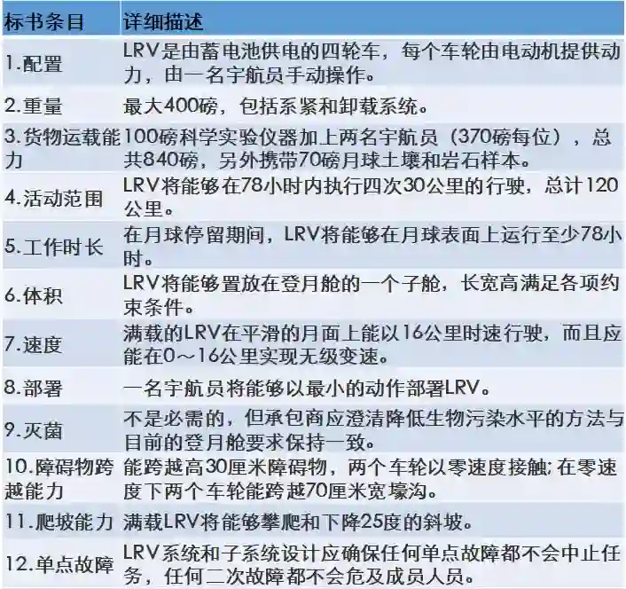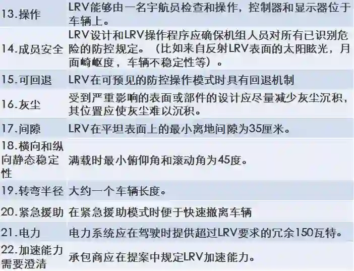 然后,在 1969 年 7 月 11 日,也就是在阿波罗 11 号登月成功之前不久,LRV 任务组根据之前的广泛研究,向 29 个 NASA 承包商发出标书,列出了月球漫游车的 22 项具体要求,分别是: