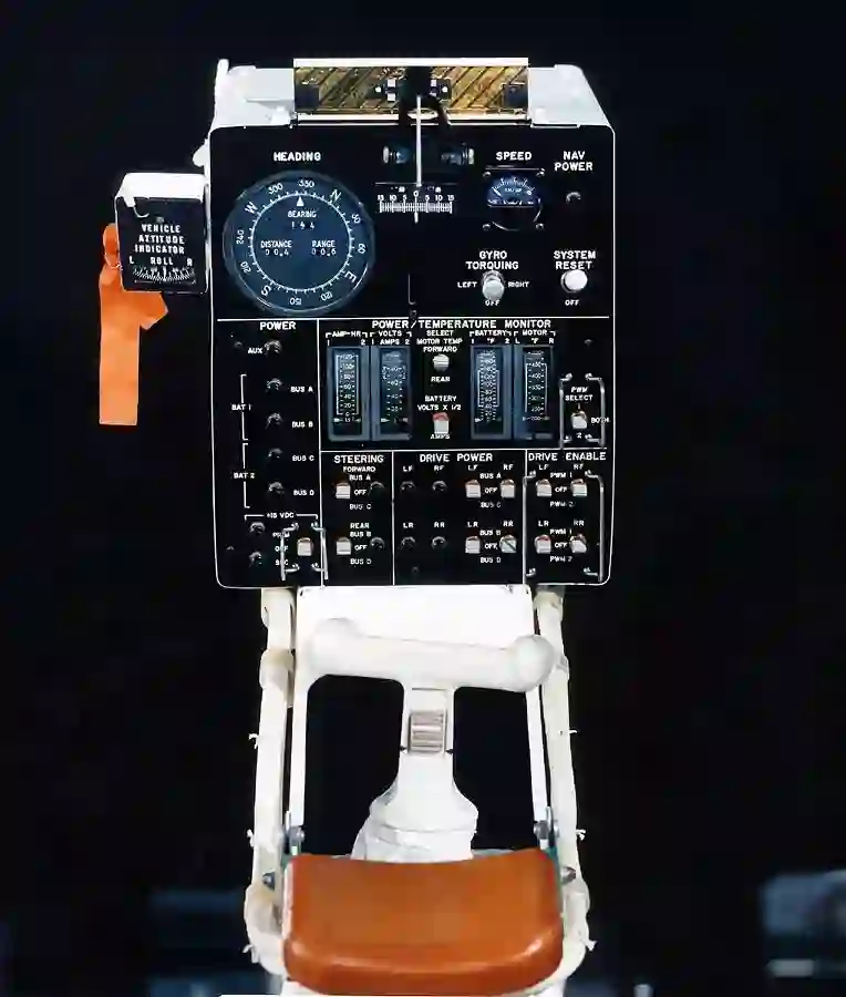 中控台被刷成亚光黑色,防止阳光反射影响驾驶。在 50 年前设计的中控台,基本和现在的豪华汽车可以媲美,因为除了必须的速度、行驶距离、续航电能等常规显示之外,波音公司设计了一套含陀螺仪和行驶距离存储计算功能的导航系统,显示和登月舱的距离和方向;在中控台顶部,还有一个类似日晷的装置,可以根据太阳的方位角,人工判定月球的参考方向,确保导航仪的准确性,防止宇航员在月球走失。