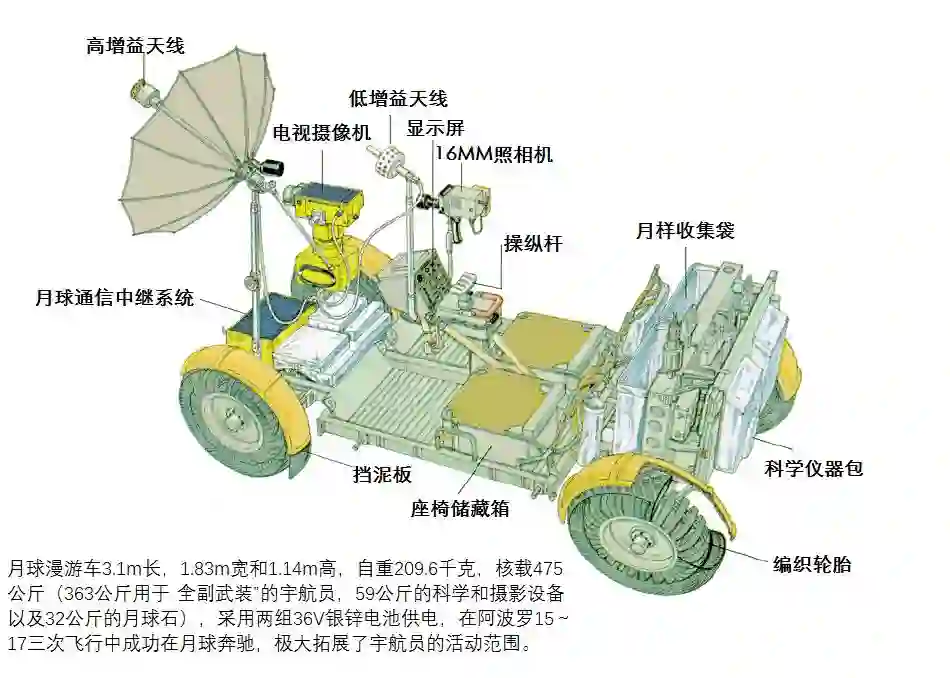 月球漫游车还配备了一台电视摄像机、一台机载 16mm 遥控相机,拍摄画面直达休斯顿,前卫的行车记录仪设计!信号是通过高低增益的 2 个天线回传月球轨道上的 CSM 舱和地球进行通信。